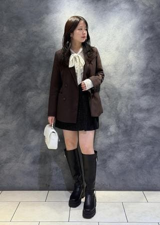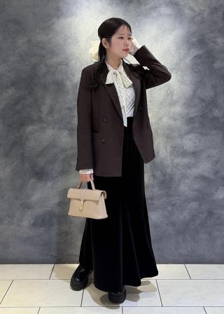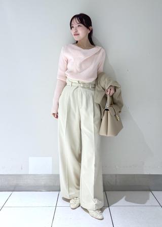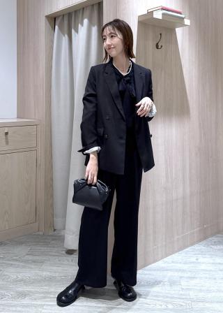 インナーにロゴロンTを着用し、ボトムはセットアップのウーリッシュワイドパンツ(品番:BVS65100)を合わせたキレイ目カジュアルがおすすめ。シアーリボンブラウス×デニムパンツに羽織として合わせることで、デートや女子会などオフシーンにも使えるジャケットとしてご活用いただけます。