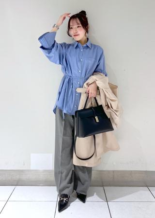 裾が広いのでベルトをリボン結びできゅっと絞ってワンピースのように着ていただくスタイリングがおすすめ。