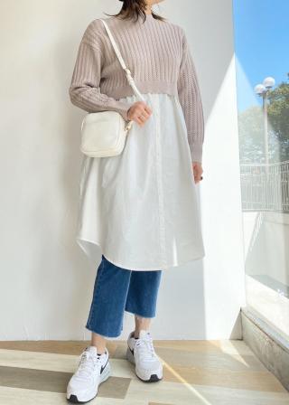ニットと布帛を組み合わせたドッキングデザインのワンピースです。