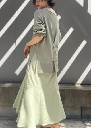 バックのレースアップリボンが後ろ美人なニットトップスです。ワンピースは、裾の切り替えた揺れる感じのフレアラインが歩く時の足元を美しく見せてくれます。