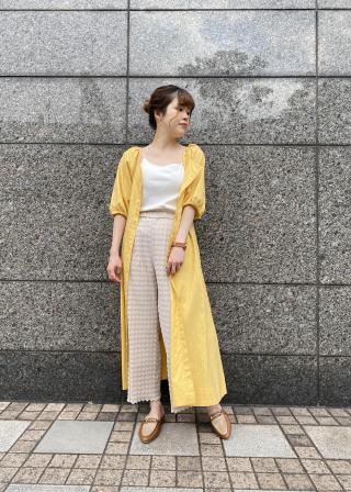 釦前にしてウエストより下を開けて、パンツとのレイヤードスタイルもおすすめです。