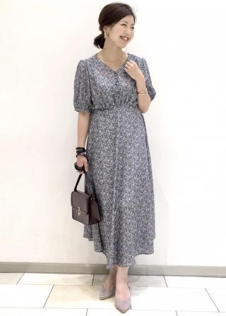 ハイウエストでスタイルアップ。フラワープリントくるみ釦ワンピース