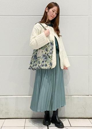 トップスとスカートを微配色にして、コーディネートして見えるようにしています。