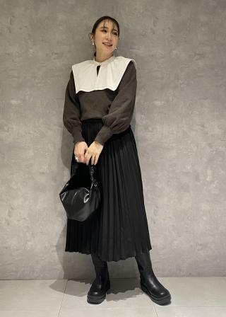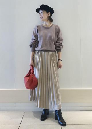 微光沢サテンのスカートが上品で、ニットもボリュームスリーブのきれい目なシルエットにしています。