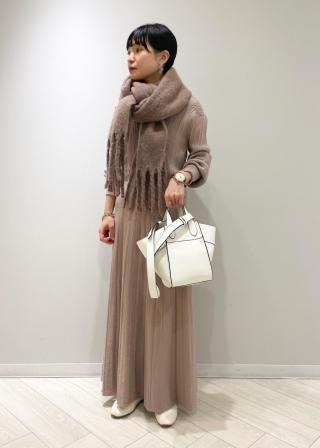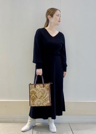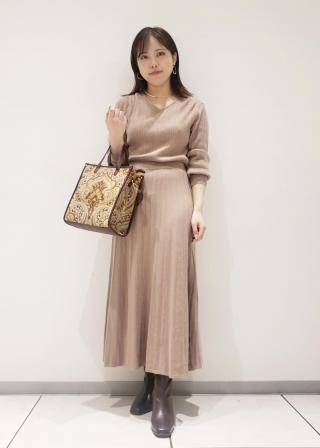 ニット素材ですが、首元のVネックから見えるデコルテやスカート部分のプリーツのデザインが重く見えず