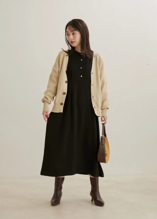 スタイルが良く見えるようにウエスト位置を高くとり、程よい分量感のタックと裾に流れるラインで女らしいシルエットのワンピースに仕上げています。
