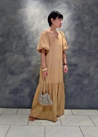 ボリュームスリーブは程よいボリューム感!動くと裾が広がり軽やかな印象のワンピース。
