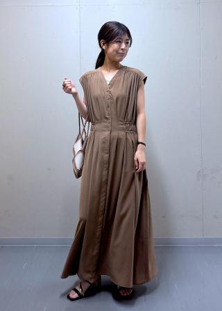腰位置を高く見せてくれるようなウエスト設定と、肩のギャザーをたっぷりいれ上半身を華奢に見せれくれる様に細かいディテールに拘ったワンピースです。