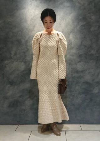 クロス編みの表面感とボリュームスリーブのマーメイドニットワンピース。
