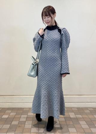 クロス編みの表面感とボリュームスリーブのマーメイドニットワンピース。