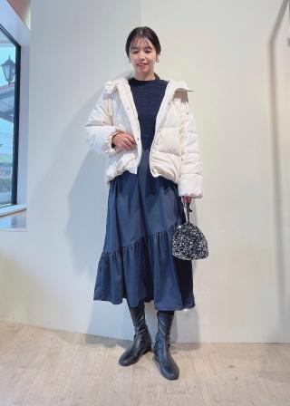 バルキーアクリルのハイゲージニットトップスと、微起毛素材のスカートとのドッキング仕立て。
