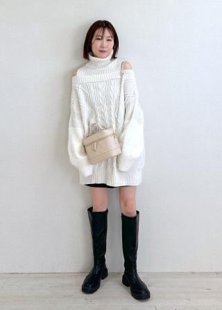 肩がちらっと見えるオフショル風ハイネックニットケーブルミニワンピース。