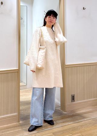 フロントに散りばめたパール・メタル・ダイヤのビーズが華やかな印象のフンワリ温かいミニ丈ニットワンピース。