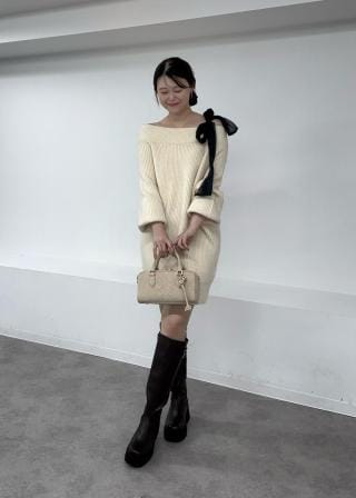 リボンを付けてアシンメトリーに肩を出し、ロングブーツ合わせの着方が一番おすすめですが、リボンを取り外して、ラフにオフショルダーニットワンピースにして、デニムパンツやナローパンツ、ショートパンツなどとのレイヤードの着こなしも◎。