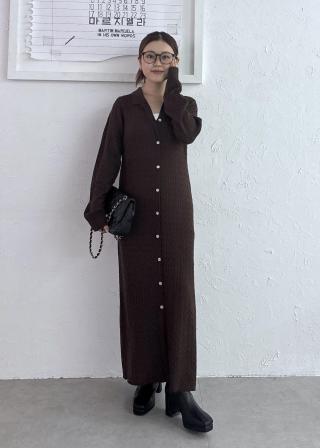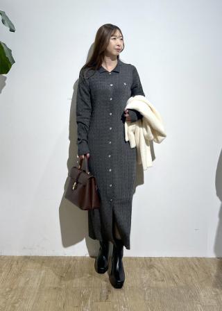 Iラインシルエットの女性らしさの詰まったポロ襟のケーブルニットワンピース。