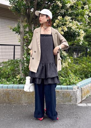 今年らしいキャミワンピ♪微光沢感のある上品な素材で軽くてとても着やすい。肩紐は調整できるので、好みの位置に調整できて嬉しい◎裾のフリル使いがふわっと優しくゆれ、今年らしいレイヤードスタイルがオススメの着方です。全体的に程よくゆったりした印象でした。
