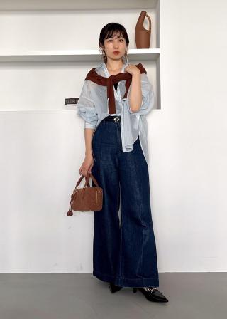 デニムワイドパンツはハイウエストでスタイルアップを
