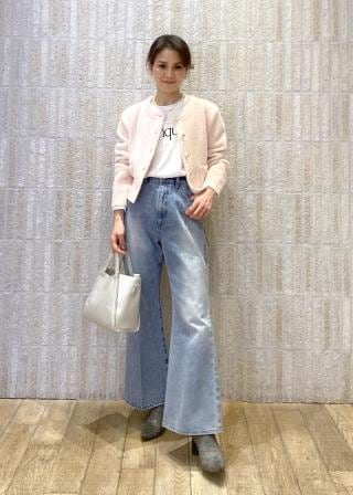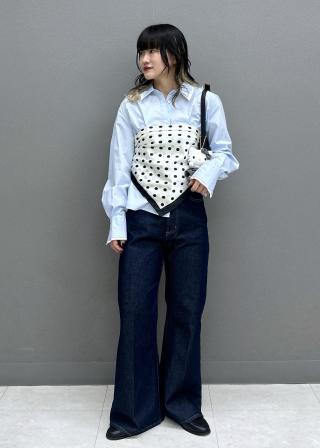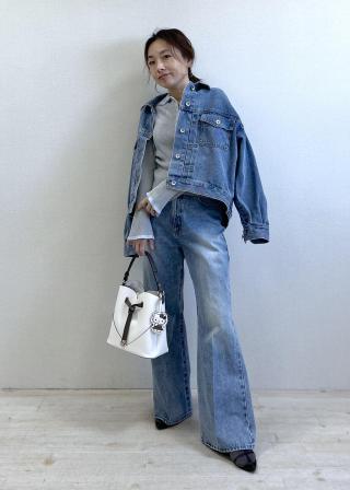 コットン100%のデニムなので最初は硬めですが履きこんでいくとどんどん馴染んでくるので、ぴったりめのサイズで購入していだくのがおすすめです。インディゴブルーに相性のいいAGLDのタックボタンがアクセントに