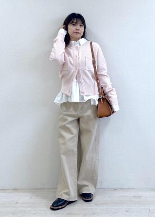 女性らしいブラウスやニットなどに合わせてカジュアルダウンしたスタイリングがおすすめです。