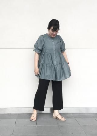 落ち感のある素材を使用しているので、体のラインを拾わずストンと下に落ちるシルエット感です。