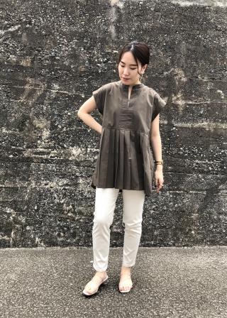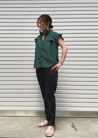 パンプスやサンダル、スニーカーなどのシューズに女らしくコーディネートできるパンツの着丈にこだわったサイズ感にしています。