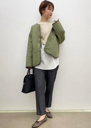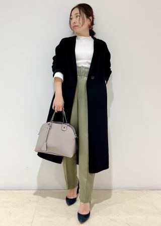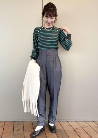 これから寒くなるにあたり、厚手のモコモコしたニットのボトムとしてのツヤ感パンツはアクセントにピッタリの1本です。