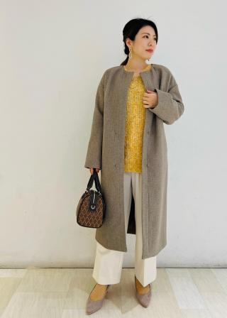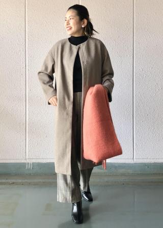 表側はサラっとした素材感なので、ミドルゲージやローゲージのフワフワしたニットなどとの相性も良く、冬のスタイルアップにヘビーローテーション間違い無しの一本です。