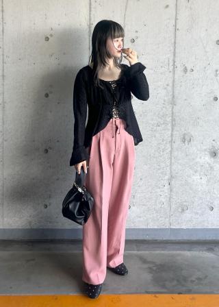 パンツの裾からちらっとスタッズをのぞかせるバランスがおすすめで、特にベロア素材のピンクはデニムに合わせるのがおすすめです◎