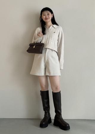 ・厚底ソールは脚が長く見えるヒールアップ型を採用し、足元に重さを出せつつ少し抜け感を出してカジュアル過ぎない見え方に。