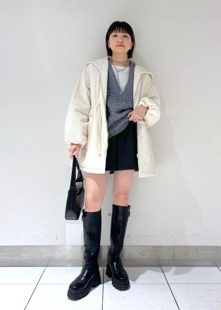 ・厚底ソールは脚が長く見えるヒールアップ型を採用し、足元に重さを出せつつ少し抜け感を出してカジュアル過ぎない見え方に。
