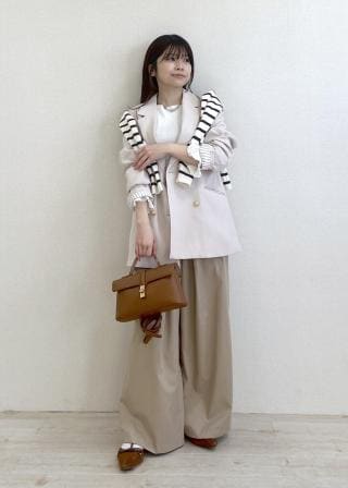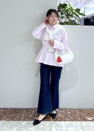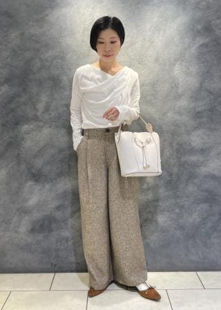 ワイドパンツやロングスカートに合わせてトゥ先やリボンがチラリと見えるバランスで合わせて頂くのがおすすめ。