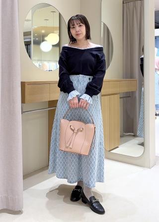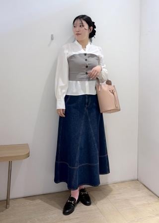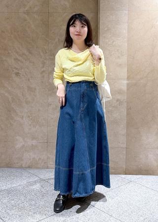 後ろ姿までもかわいいフレアシルエットデニムスカート。梅春の時期にまだ寒いけど冬のスタイリングに飽きたお客様にぴったりの万能デニムアイテムです。
