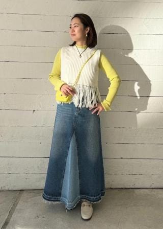 女性らしいラインのデニムスカートなので女っぽニットとの相性抜群です。