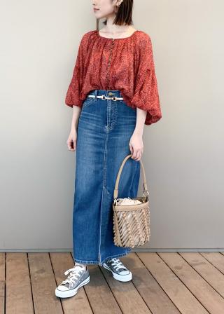 ボリュームのあるブラウスに合わせたメリハリのあるコーディネートがおすすめ。