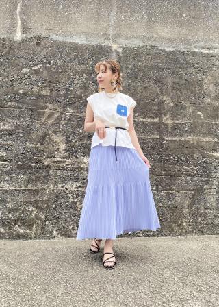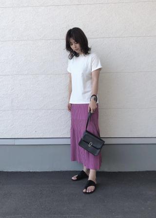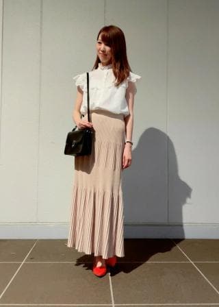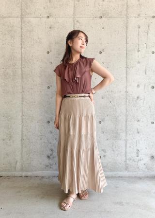 シャリ感のある素材を使用し、夏まで着まわせるプリーツニットスカートです。