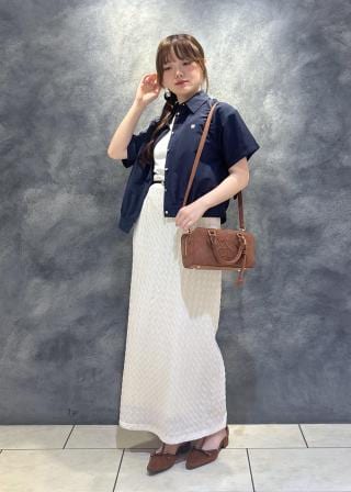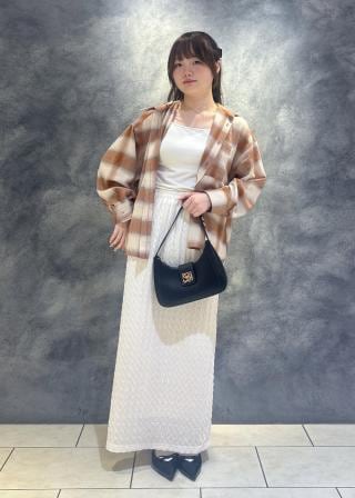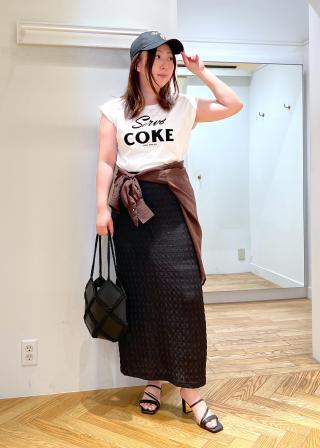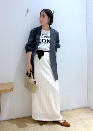トップスはゆったりしたシルエットのアイテムがおすすめですが、コンパクトなTシャツも女っぽくマッチする万能スカートです。