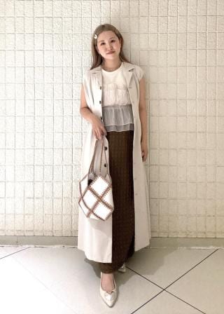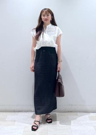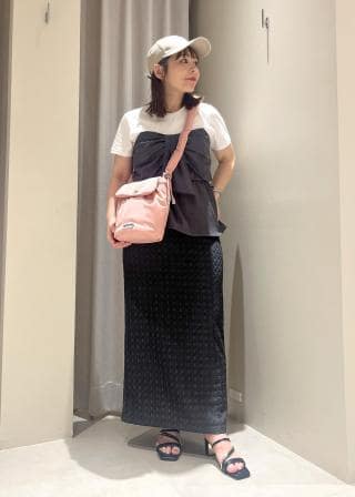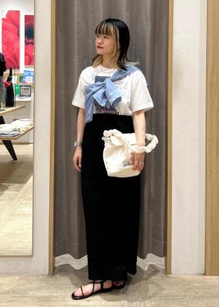 トップスはゆったりしたシルエットのアイテムがおすすめですが、コンパクトなTシャツも女っぽくマッチする万能スカートです。