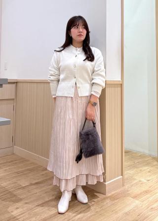 ボリュームのあるニットカーディガンやスウェットなどのプルオーバーをトップスに合わせるスタイリングがおすすめです。