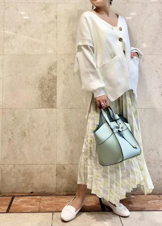 後ろが長めの丈にしているので、ゆったりとしたTシャツやブラウスと合わせるのがおすすめ。