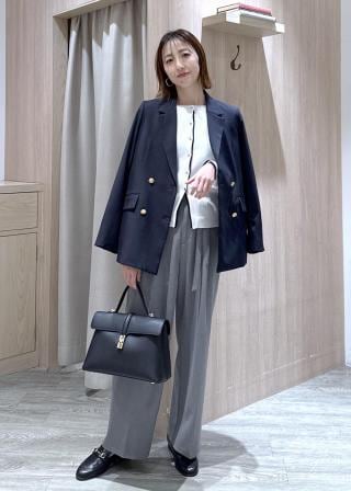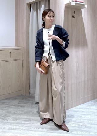 コンパクトなトップスなのでワイドパンツと合わせるとバランスの取れたスタイルに。デニムパンツとも相性抜群!第二釦まで開けてデコルテ周りをキレイに見せつつ、カラーもチラ見せさせるのがおすすめです。
