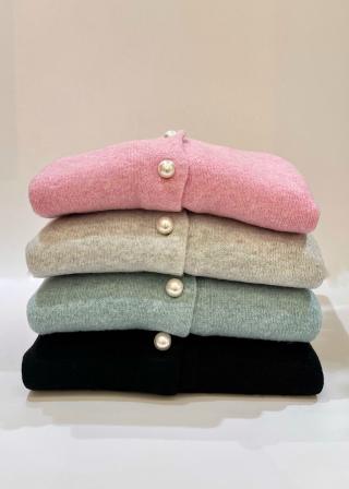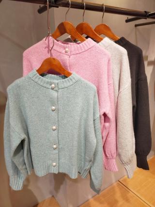 大きめサイズのパール釦が付いた女性らしいニットカーディガンです。