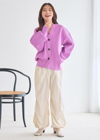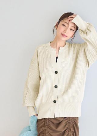 キーネックデザインと構築的なフォルムが出せる糸使いの編地とパターンで抜け感が出る着方が楽しめるカーディガンです。