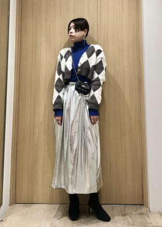 ラメが入ったアーガイル柄が目を引くショート丈のカーディガンです。