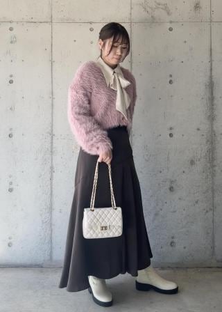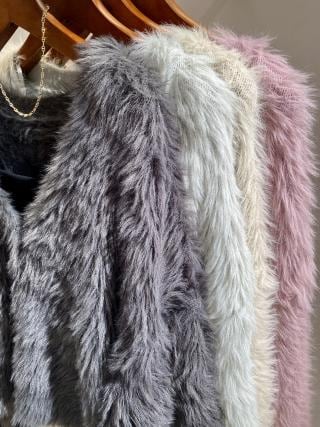 ふんわりとした毛足と肌あたりが柔らかく着心地が良い素材で、着ているだけで癒されるニットです。