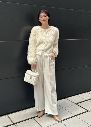 ふんわりとした毛足と肌あたりが柔らかく着心地が良い素材で、着ているだけで癒されるニットです。