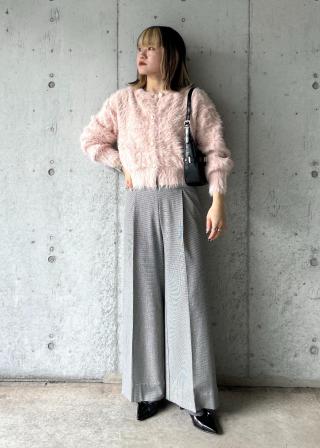 ふんわりとした毛足と肌あたりが柔らかく着心地が良い素材で、着ているだけで癒されるニットです。