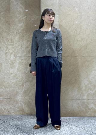 ワンポイントの刺繍入りケーブルカーディガンです。スカート、パンツ、デニム