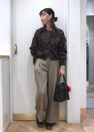 袖口はしっかりと止まるようリブの設定をしているので作業の際などたくし上げられます。首回りも広げすぎず、トップスとしても着用ができるサイズ感。前開きのカーディガンですが柄を主役にするために釦は裏側にスナップ釦にしております。