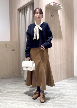 同素材のニットスカート(品番:BVC45130)とのセットアップはかわいくておすすめです!単品でも着やすいカーディガンはワイドパンツとの相性も抜群!深すぎないVネックなので1枚で着てもいいですし、中にレースやTシャツを合わせてもかわいいです。