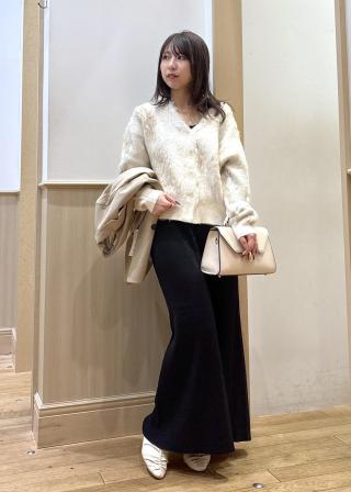 シャープなVネックの衿ぐりが、ルーズなシルエットを女らしくふんわりと包み込んだようなスタイリングへと導きます!